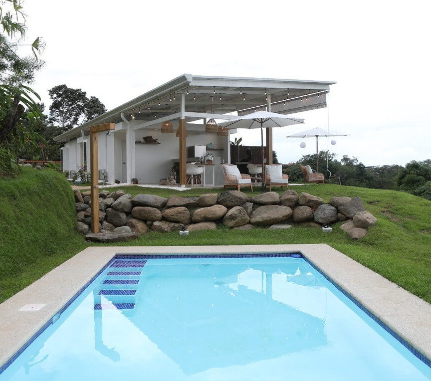 El lodge cuenta con una zona de «rancho» con sofa y sillones, con vista a la piscina y al mar; y la zona de la piscina con hamacas reclinables para descansar y refrescarse.
